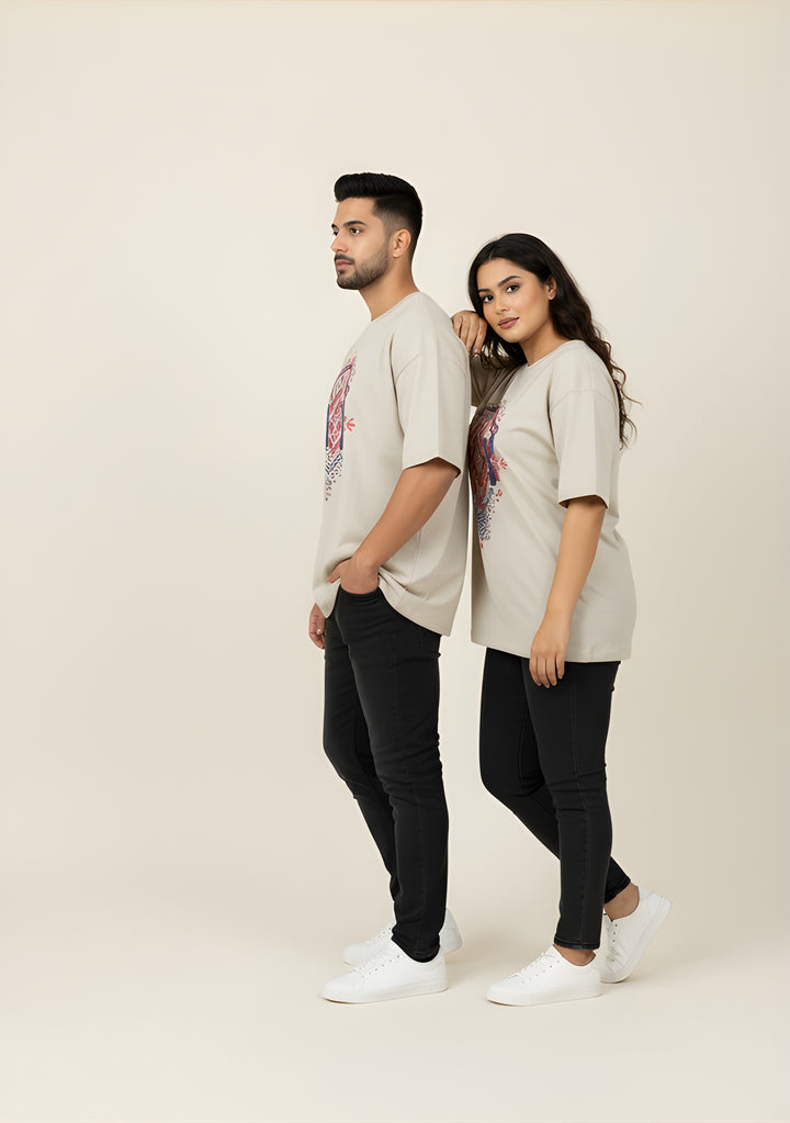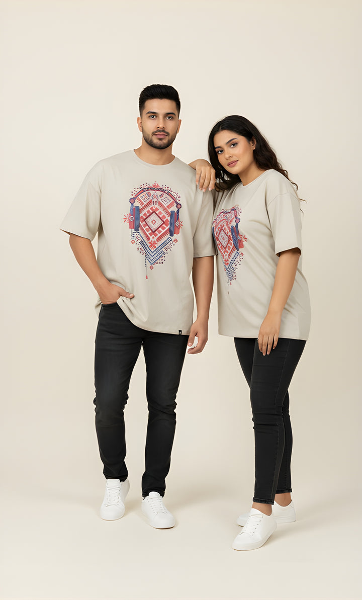 Discover the perfect fusion of music and heritage with our Drop Shoulder Threads In Sound tee. This unique design features an intricate ethnic musical instrument graphic with traditional geometric patterns, exclusively printed on the front for a bold artistic statement.